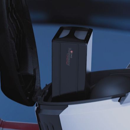 The scooter's battery is an LFP Li-ion 72 V 30 Ah configuration that takes you up to 111 km before requiring a recharge. The scooter comes with a charger delivering 7A/12A to keep the battery charged at an optimal speed.