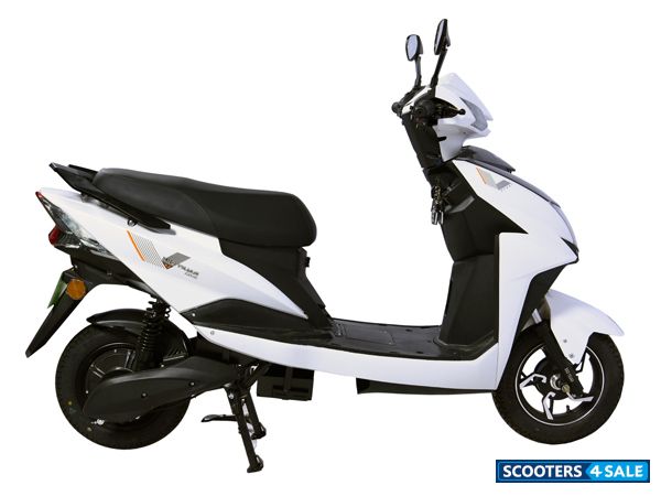 The EKO Tejas AXEL Lead Acid Electric Scooter is available in different colors: Sky Blue, Yellow, Red, Blue, Grey, and White. It has a maximum power of 250 watts and can carry up to two passengers and luggage. The scooter is equipped with a BLDC motor and has a range of up to 55 kms or 65 kms, depending on the battery variant, which is 48V ~ 28 Ah lead acid or 60V ~ 28 Ah lead acid.