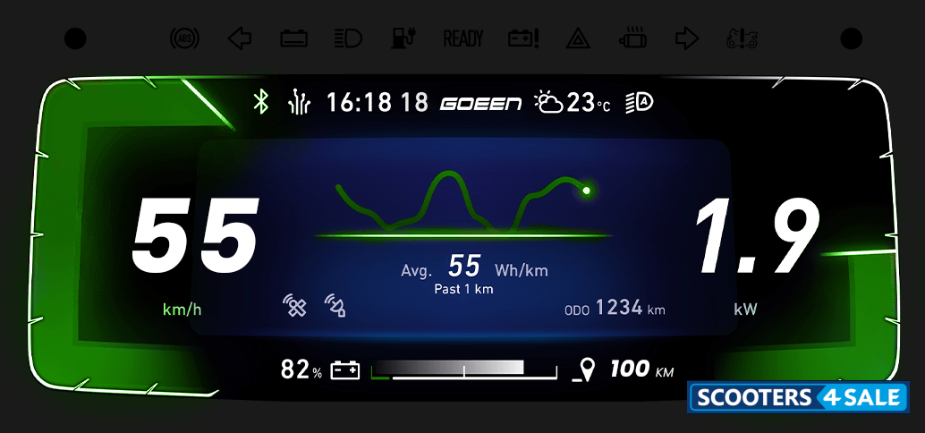 The Goeen Chalo 1000 V2 Electric Scooter powered by a 3000 W BLDC Hub Motor, it effortlessly conquers inclines with a 32% climbing grade. Three riding modes - Eco, Sport, and Hyper - cater to your speed preferences. With a maximum range of 100 km, you'll rarely worry about charging, which takes just 4.5 hours. The smart LED color dashboard keeps you informed, while regenerative braking, Bluetooth connectivity, and a smart key add modern convenience. The 2.16kWh lithium battery boasts a 3-year warranty, making the Chalo 1000 V2 a reliable choice.