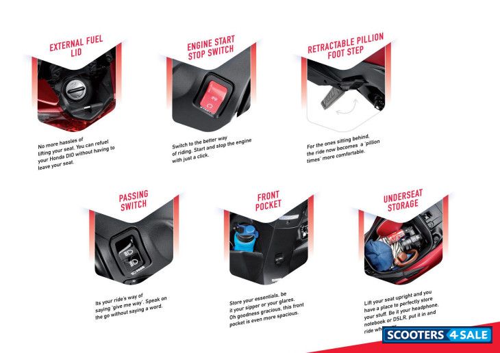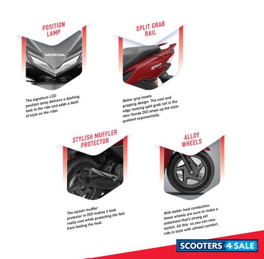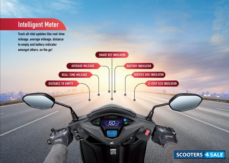 The scooter is available in attractive colors like Mat Sangria Red Metallic, Matte Dark Blue, and Pearl Igneous Black, allowing riders to express their individuality. Packed with features like a smart key, external fuel lid, engine start/stop switch, silent start with ACG, and eSP technology, the Honda Dio H-Smart Scooter offers a convenient and advanced riding experience. With a starting price of Rs. 77,712 (ex-showroom Delhi), it provides great value for money.