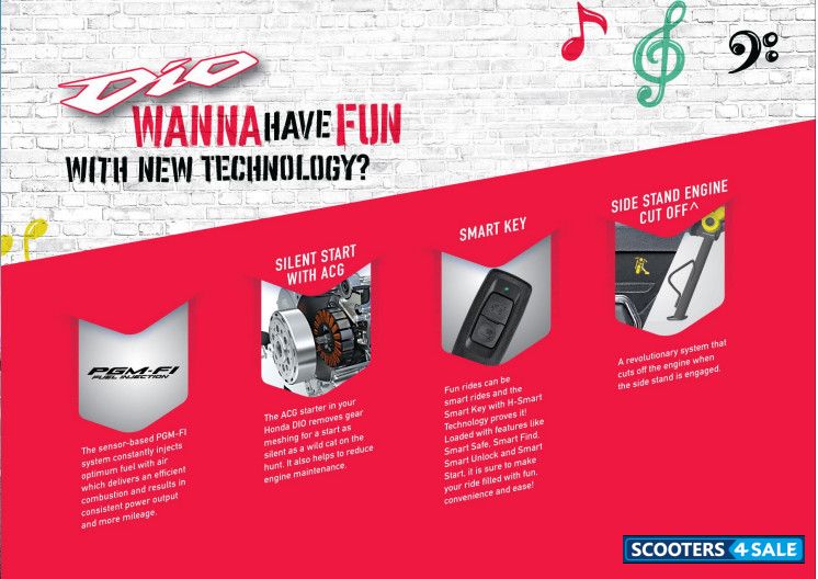 The Honda Dio H-Smart Scooter is a compact and stylish ride that packs a punch. Its 109.51 cc 4-stroke SI engine delivers a maximum power of 7.85 PS at 8000 rpm, providing an exhilarating ride on city streets. With a maximum torque of 9.03 Nm at 5250 rpm, it offers excellent acceleration and responsiveness.