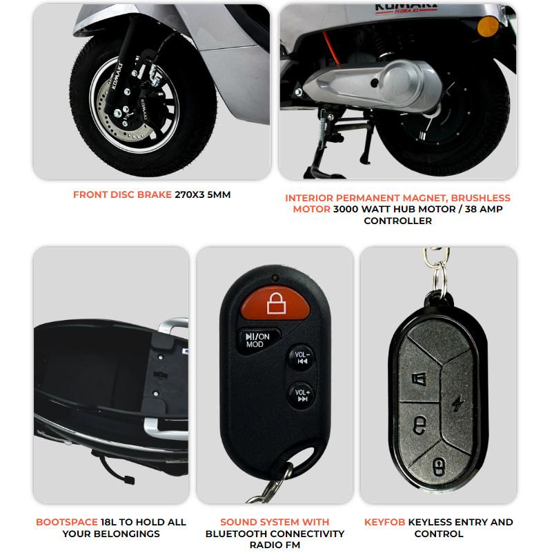 However, it's not just the performance that makes the Komaki Flora shine, it's also the attention to detail in terms of features and technology. The scooter sports a vivid smart dash that provides vital information at a glance. The 18L boot space is generous for an electric scooter, accommodating everyday essentials with ease. The inclusion of a sound system with Bluetooth connectivity and FM radio adds a delightful dimension to the riding experience, while the keyfob keyless entry and control inject a sense of modern convenience. Standout safety and utility features like Parking assist/cruise control, Reverse assist, SOS (emergency) button, and the wirelessly updatable features confirm the Komaki Flora Electric Scooter as a well-rounded, contemporary choice for the urban rider.