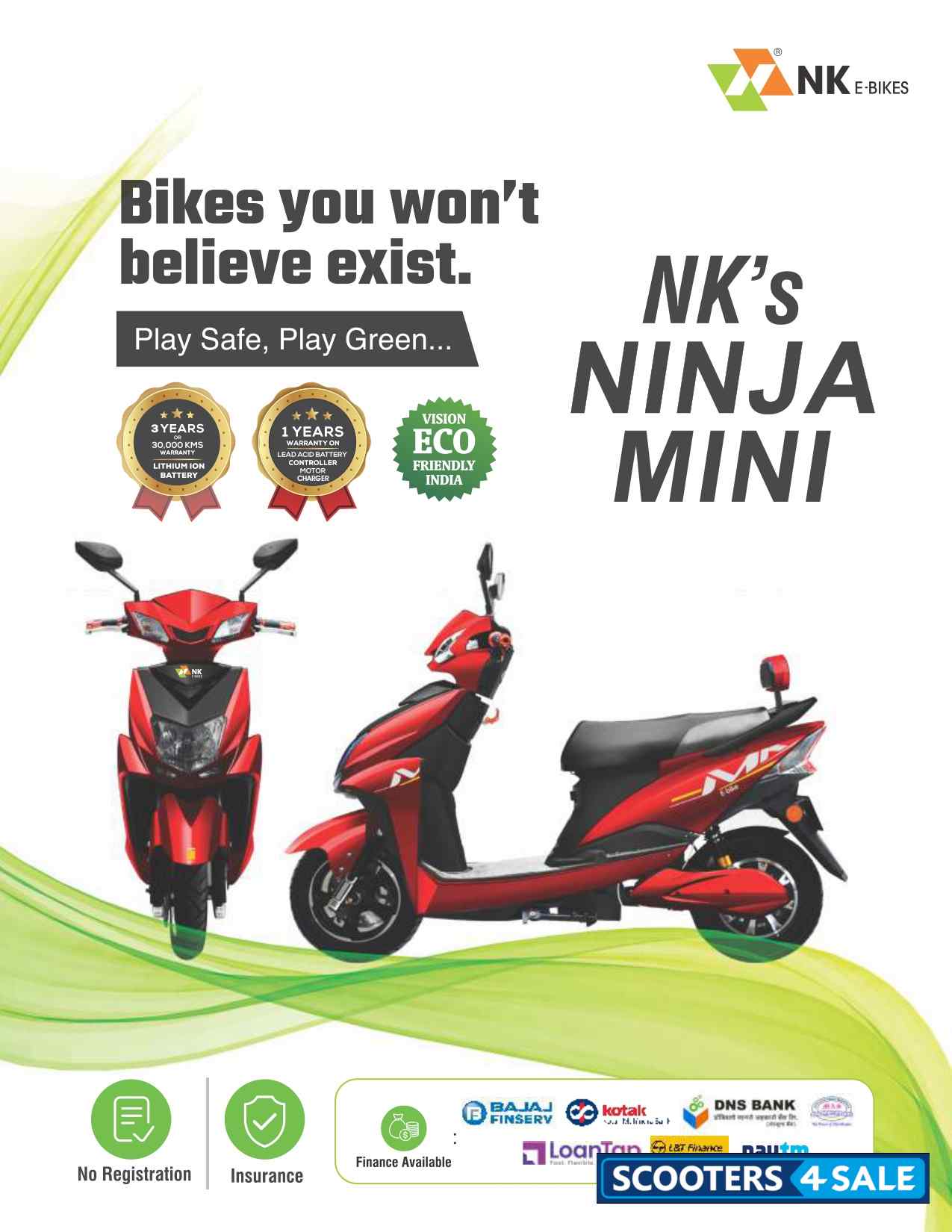 The NK E Bikes Ninja Mini Electric Scooter is powered by an IP67 waterproof BLDC hub motor, it effortlessly carries a load of up to 220 kg. With a range spanning 70-90 km on a single charge and a swift 2-6 hour recharge time, it's well-suited for city commutes. Its LED display keeps you informed, while the VRLA and Li-ion battery options cater to different needs. Safety features include hydraulic shock absorbers, drum brakes, and an array of nifty extras like cruise control, reverse gear, and an anti-theft alarm. Plus, its compact size means no license is required. A smart choice for nimble urban travel.