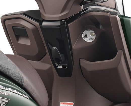 The scooter is fitted with alloy wheels and has a fuel tank capacity of 5.5 L, making it an ideal choice for daily commuting. The Burgman Street Ride Connect Edition comes equipped with a front disc brake and a rear drum brake for efficient stopping power. The front suspension system is telescopic, while the rear features a swing arm, providing a comfortable ride even over bumpy roads.