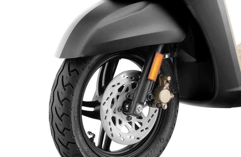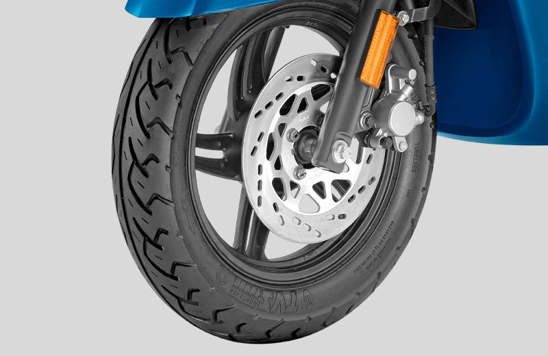 The TVS Jupiter ZX SmartXonnect has a length of 1834mm, a width of 678mm, and a height of 1286mm. It has a ground clearance of 163mm (unladen) and a kerb weight of 109kg, making it easy to maneuver in traffic. The scooter also features a 220mm disc brake at the front and a 130mm drum brake at the rear, which provides ample stopping power.