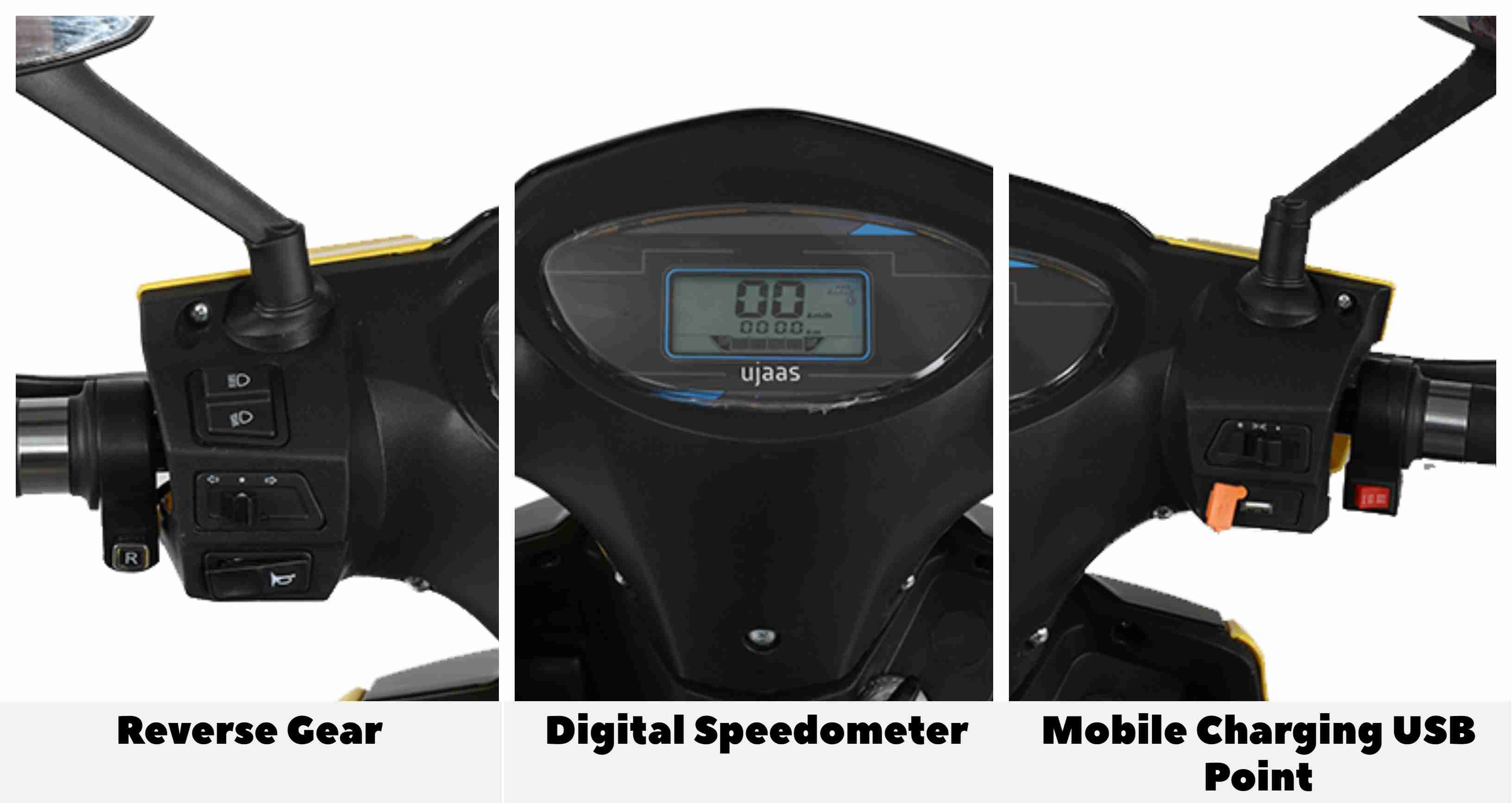 The Ujaas eGo LA Electric Scooter is a great choice for city commuters. It runs on electricity, so it's eco-friendly. You can get it in Red or Blue. It has a 250 W motor and can carry up to 8 liters of stuff. You can choose from 3 different speeds and even go in reverse. Charging takes 6-7 hours, and it uses a Lead Acid battery with a 48V/60V charger. The scooter has drum brakes, a telescopic front suspension, and hydraulic rear suspension for safety and comfort. Its tubeless tires (3.10 x 10) provide a smooth ride on various roads. Overall, the Ujaas eGo LA is a reliable and eco-conscious choice for modern commuters.
