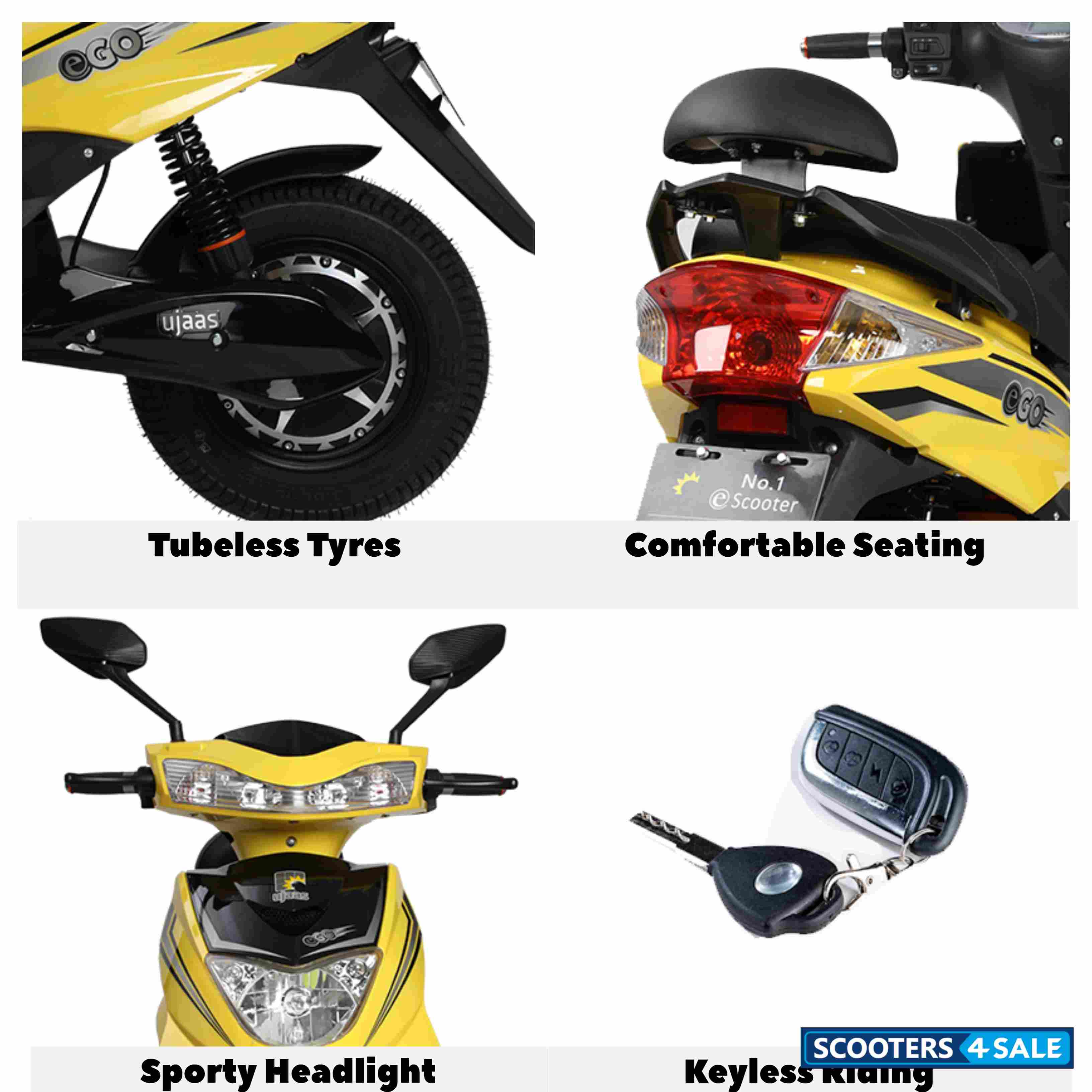 The Ujaas eGo LI Electric Scooter is an eco-friendly ride with a 250W electric motor. With a load capacity of 8 liters, it's perfect for urban commuting. Its lithium-ion battery charges in 3-4 hours, and it offers three-speed options along with reverse. The scooter features drum brakes for safety and telescopic front suspension, plus hydraulic rear suspension for a comfortable ride. Its 3.10 x 10 tubeless tires provide stability. This electric scooter is a reliable and efficient choice for short city commutes, combining style and sustainability.