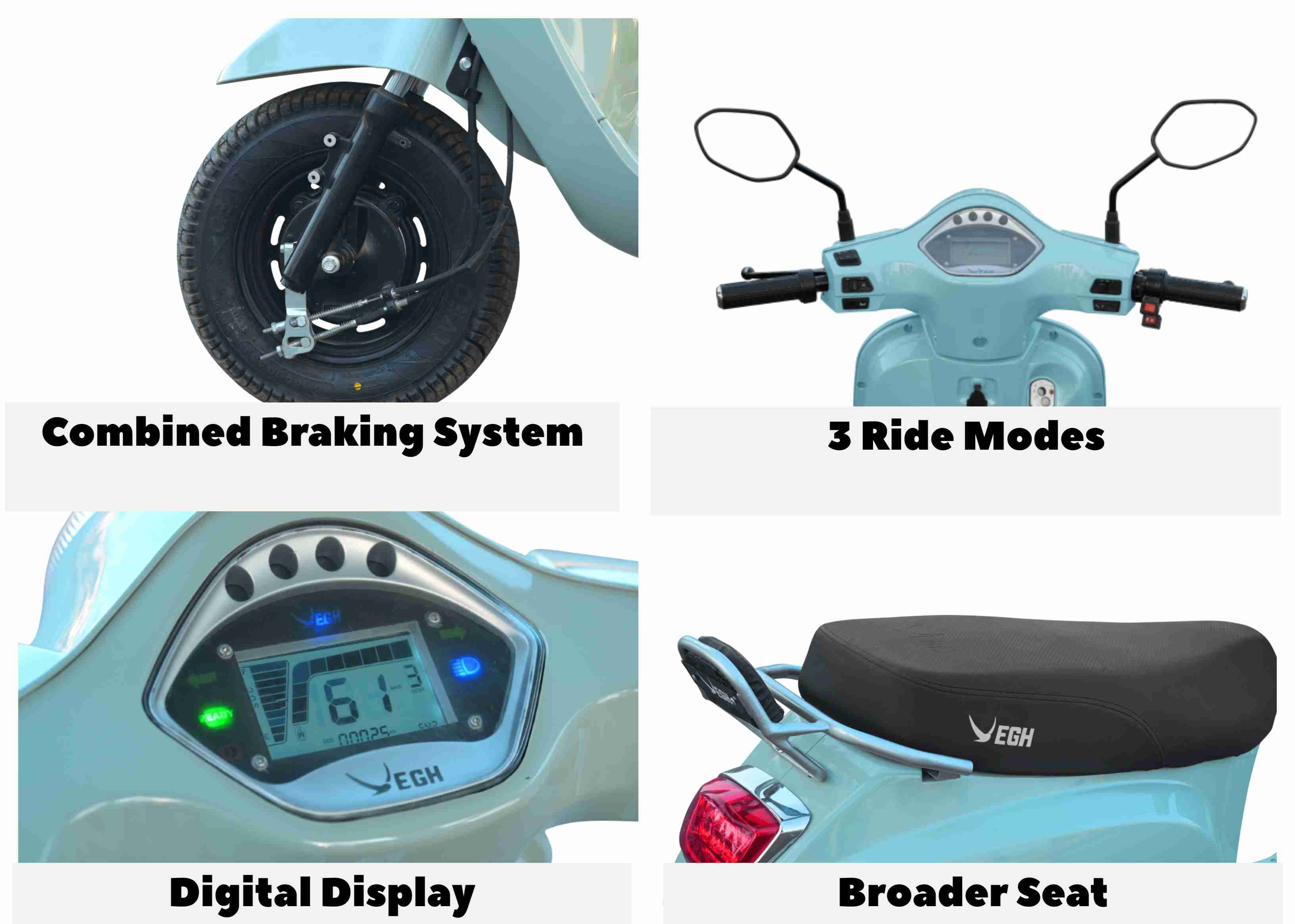 The Vegh S60 Electric Scooter combines style and eco-efficiency. Its 3.35 hp electric motor delivers a zippy 75 kmph top speed across three ride modes. With a substantial 120 km range and quick 4-5 hour charge time, it's perfect for daily commutes. The scooter features a sleek digital display and a reliable hydraulic suspension. Weighing in at 150 kg, it's a future-forward, urban mobility solution. Choose from eye-catching colors: Matt Black, Light Grey, White, or Light Green. Elevate your commute with the Vegh S60 Electric Scooter.