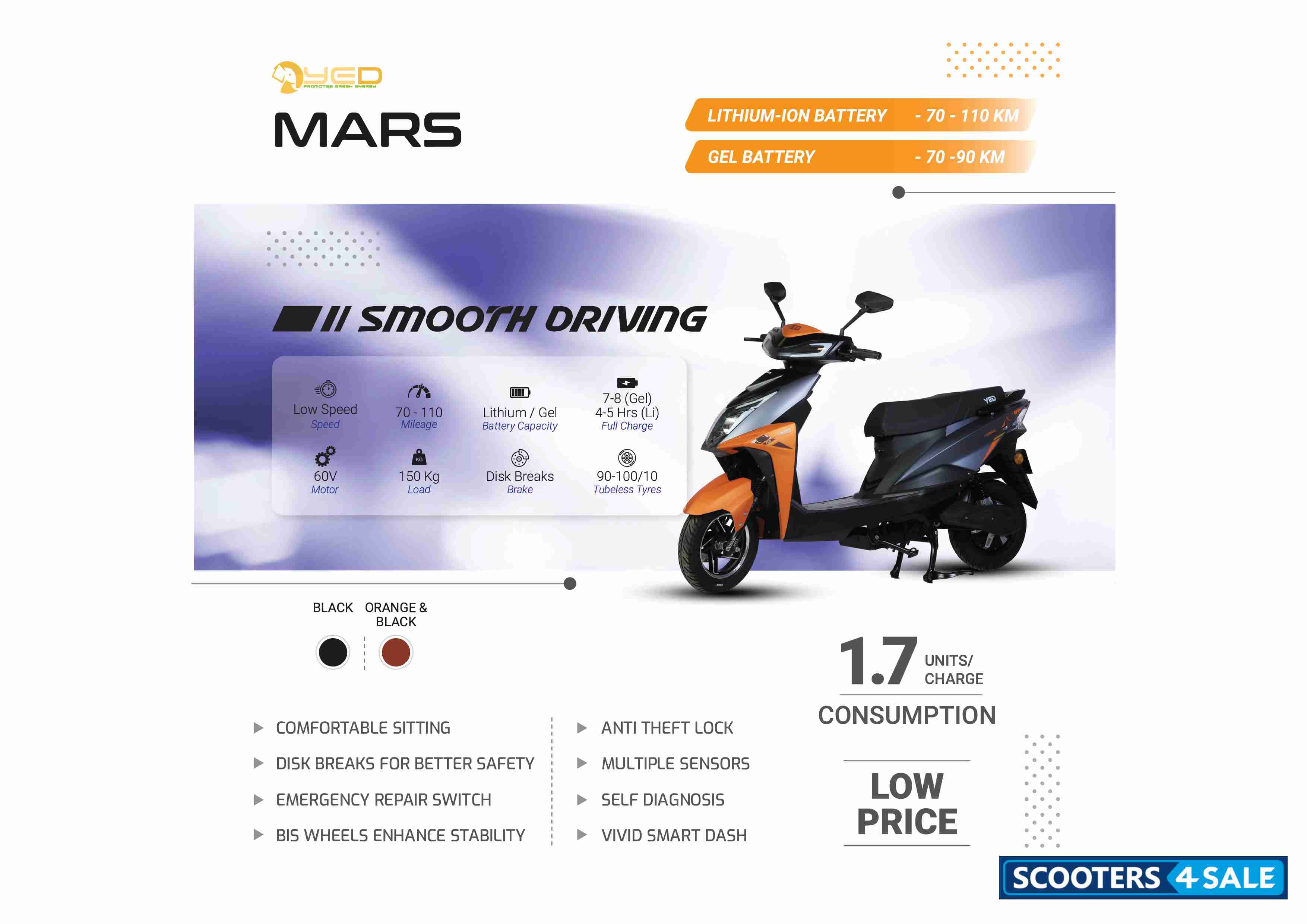 The Yed Electric Mars Electric Scooter features a 60V BLDC motor, offering reliable power for your journeys. With lithium-ion batteries, it delivers an impressive range of 70-110 km, and gel battery variants provide 70-90 km. Charging times are reasonable, taking 4-5 hours for lithium-ion and 7-8 hours for gel batteries. Notably, it incorporates an anti-theft lock, multiple sensors, self-diagnosis capabilities, and an emergency repair switch for added security and convenience. While avoiding urban-centric phrases, this scooter offers a dependable and feature-rich option for those seeking an efficient electric ride for their daily commutes.