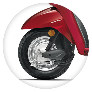 A Spring loaded hydraulic type suspension at the front and the rear makes sure that the scooter withstands all the potholes and uneven roads with much ease. The suspension works in par with the tubeless tires which reduce any chances of immediate deflation in case of a puncture. The riding quality of the new Activa is improved and it can take higher speeds with much ease.